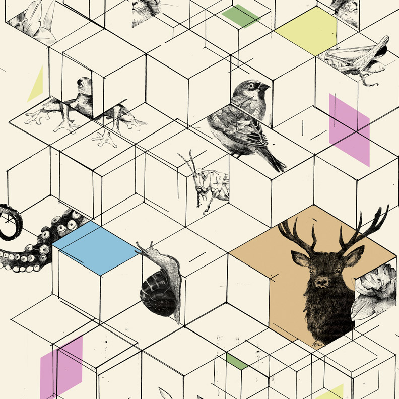 Menagerie is a deregistered isometric grid interspersed with organic illustration. Given that that was what attracted Hannah to my work in the first place, it seemed like a good place to start, so I decided to produce another grid-based composition of fragmented illustration. This time I wanted to introduce a contrast of some kind; a juxtaposition of matter interwoven among the disruption. I settled upon representing two opposing forces capable of causing such a destructive aesthetic; the brittle and beautiful composition of butterflies and the brutal, calculated complexity of machinery.