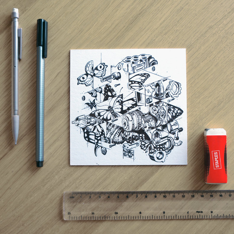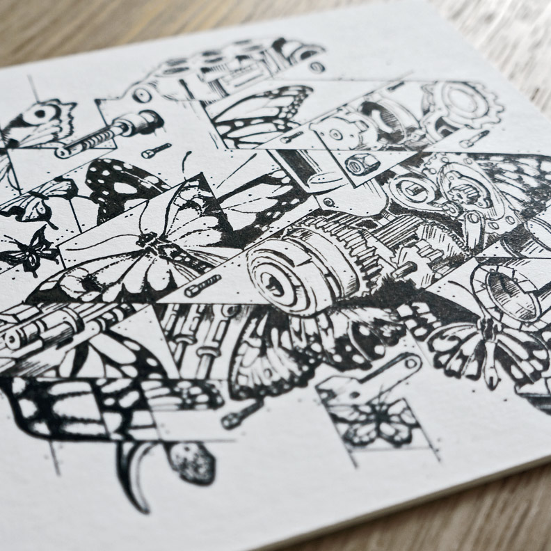 With the grid sized and sketched I began to ink in the delicate, curved lines of the wings, ranging from high-detailed close-ups where I needed a sense of weight, to full wingspans breaking free from the composition where I needed to balance the negative space. Next I blended machine parts into the gaps between, focusing on gears and cylindrical pieces to compliment the curvature of the butterflies. I also included a lot of straight-edged components to run parallel with the initial grid lines and keep the flow of the piece moving.